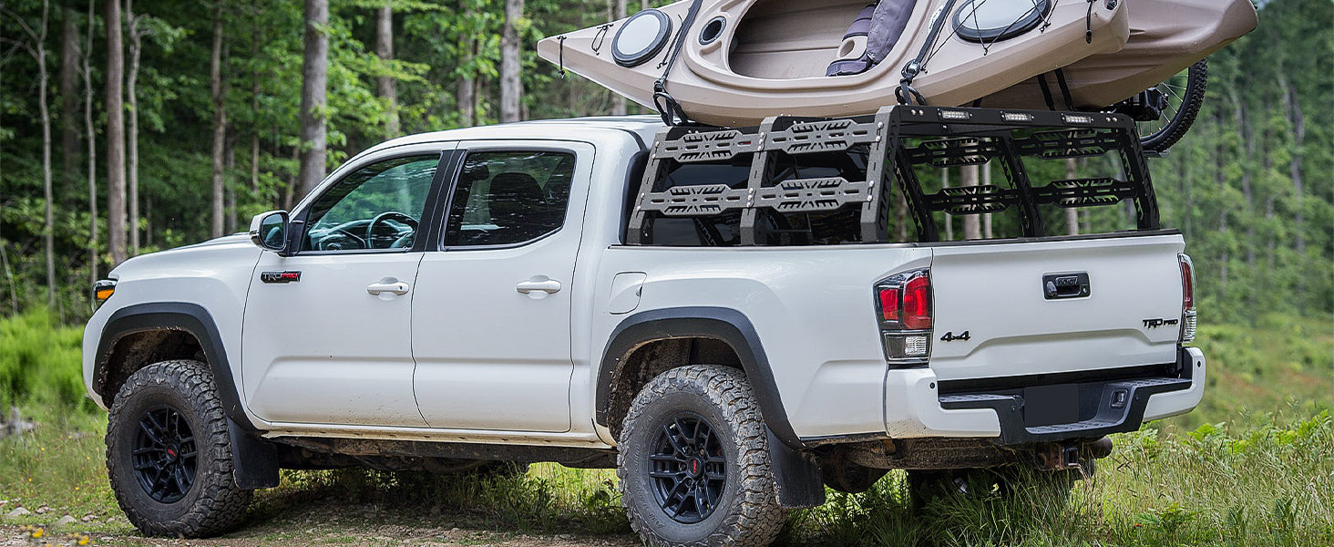 CONVENIENCE: The side features a stylish pattern design, allowing for accessory attachments to decorate your truck. The truck bed rack supports mounting essentials such as fire extinguishers, bicycles, jacks, skis, canoes, luggage, and more. Perfect for securing tents during outdoor camping, its moderate height ensures safe and easy access to items, making your travels more comfortable and convenient.